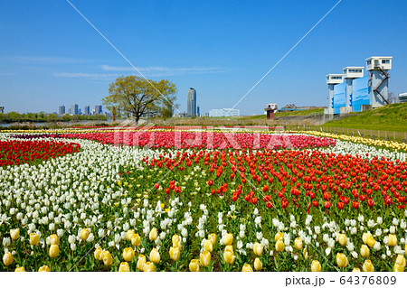 都市農業公園の河川敷に咲くカラフルなチューリップ畑と青空 水門