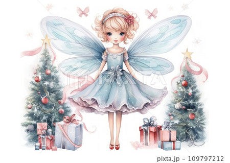 Watercolor Christmas Princess. Illustration of magical fairy with wings in blue dress with Christmas trees and gifts. Little angel girl. Ideal for children book, holiday card, kid decor, scrapbooking.