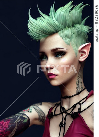 A fictional person, not based on a real person. Female elf warrior with green hair. Long pink hair, sharp elven ears, beautiful eyes. 3D render.