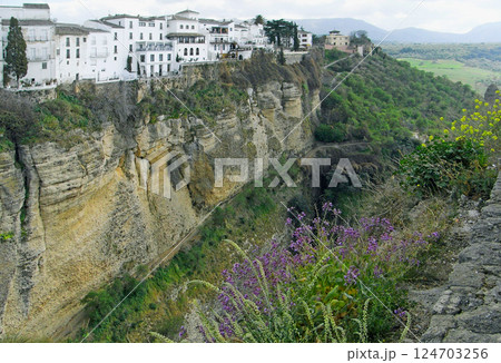 スペイン アンダルシア ロンダ、ヌエボ橋から望むエル・タホ渓谷と新市街の家並み
