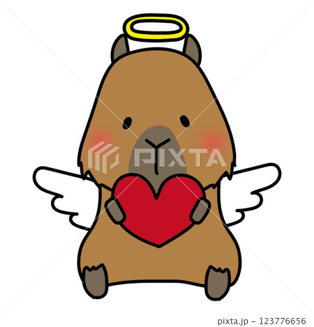 赤いハートを持っている天使の格好をしたカピバラ