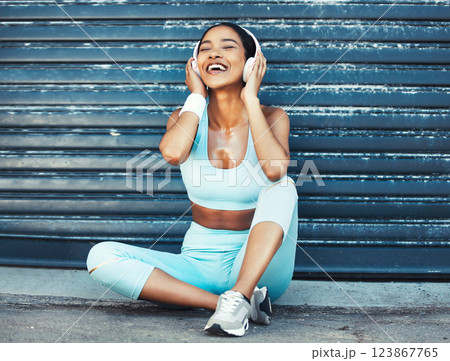 Fitness, music and happy woman with headphones sitting on ground for outdoor workout or running break. Sports, exercise and listening to streaming app on earphones enjoying favorite training playlist