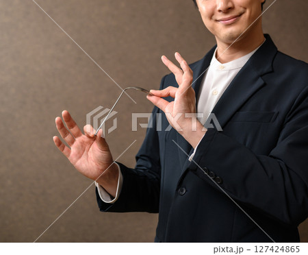 スーツに蝶ネクタイの男性の手から弾ける火花