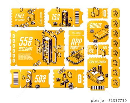Set of discount cards with fuelling gun nozzel illustration and per cent number, template layout for transport or gas station promo