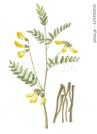 水彩で描いた黄耆 オウギ 花と根