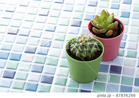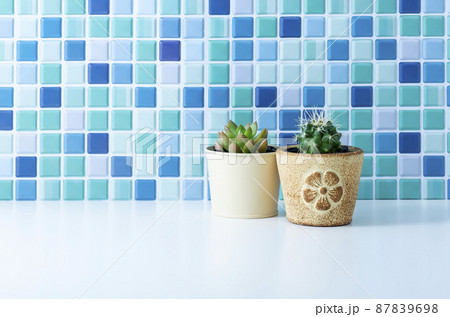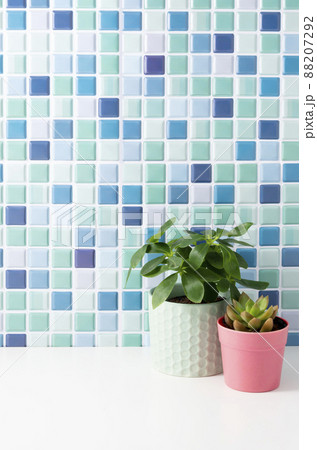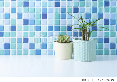 ブルーのタイルと観葉植物