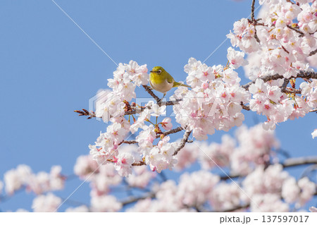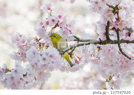 満開の大寒桜(オオカンザクラ)と蜜を吸うメジロ