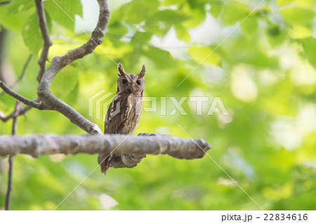 鮮やかな新緑のブナ林で枝止まりするコノハズク