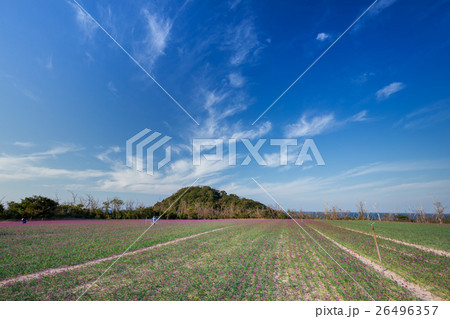 青空を背景にした鳥取砂丘東側の畑に咲くらっきょうの花 Ver1