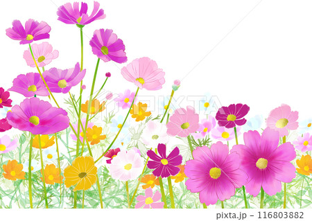 彩度低めのパステル調一面のコスモス畑