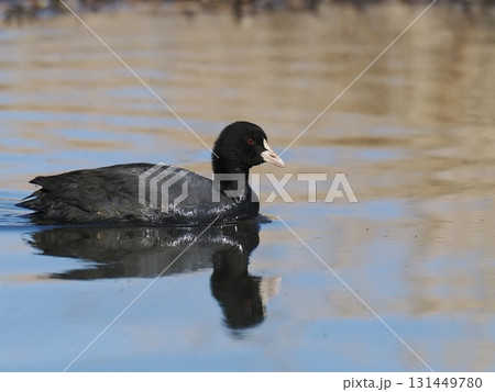 Coot (Fulica atra) swimming in the pond Laguna Escondida at Guadalhorce nature reserve outside Malaga, Andalusia, Spain.