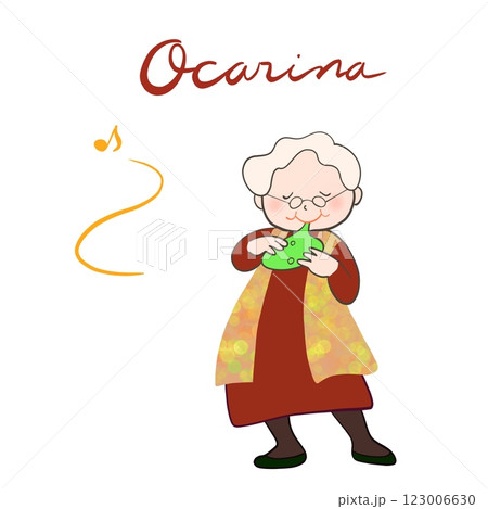 おばあさんが楽しそうにオカリナを吹いているイラスト