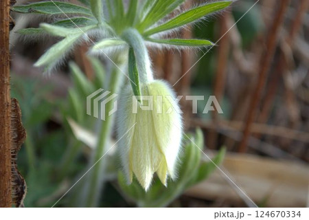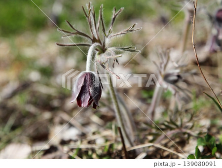 春の野の花・花弁(6枚の萼片)が下向きの時期のオキナグサ・横位置
