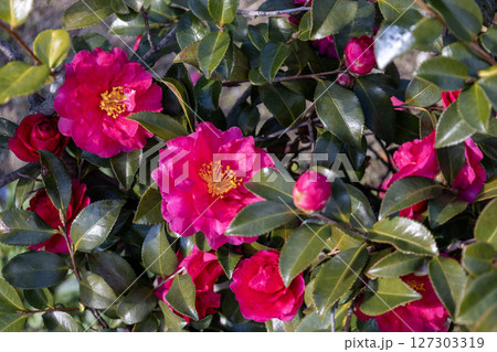 真っ赤なサザンカの花の風景
