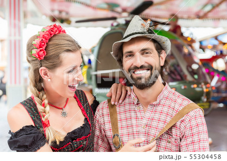 Couple visiting carrousel at the Oktoberfest in Bavaria