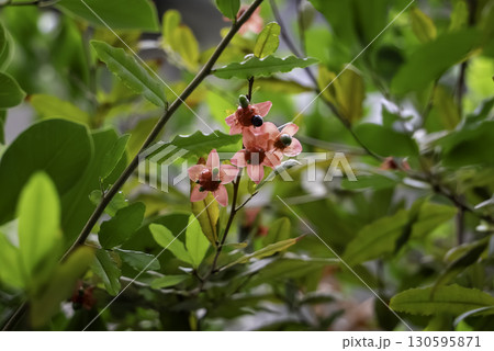 南アフリカ原産の赤い萼片の中に黒色の果実が魅力的なミッキーマウスノキ