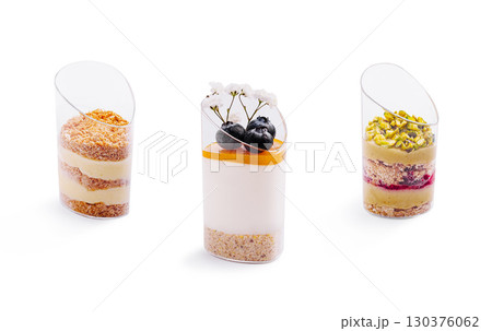 Dessert cups featuring layers of cream, fruit, and nuts in a modern presentation