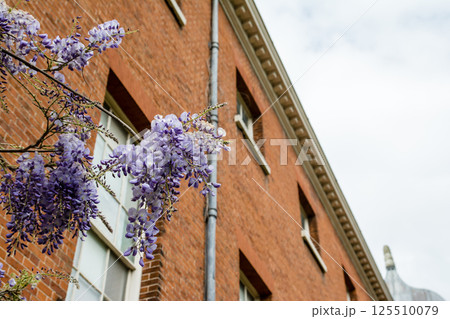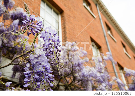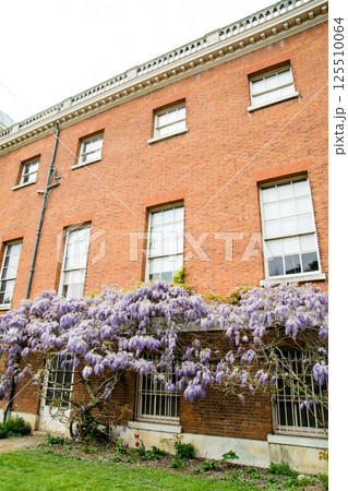 歴史的な赤レンガの建物脇にきれいに咲いた薄紫色の藤の花 ロンドン郊外のオスタリー・パークにて