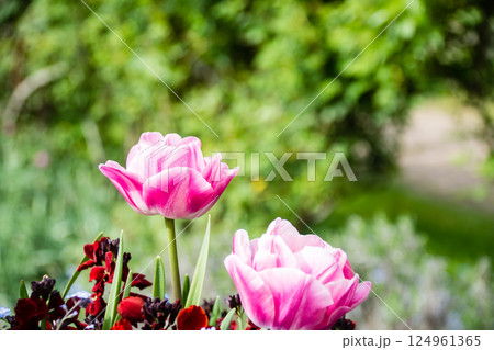 春の訪れ 薄いピンクのグラデーションがかかったチューリップ ロンドン郊外のオスタリー・パークにて