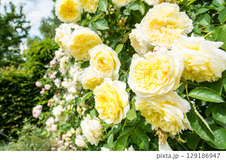 明るい日差しの下の満開のバラ ロンドン郊外のオスタリー・パークにて