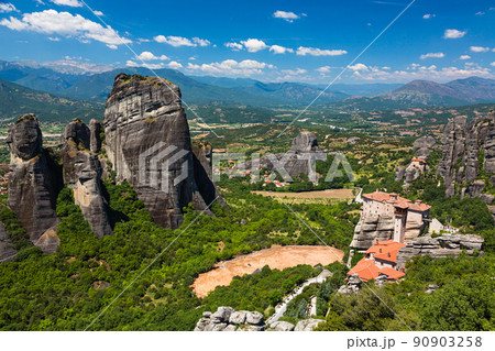 ギリシャ メテオラの断崖絶壁の岩山の上に建つ聖ニコラオス・アナパフサス修道院とピンドス山脈