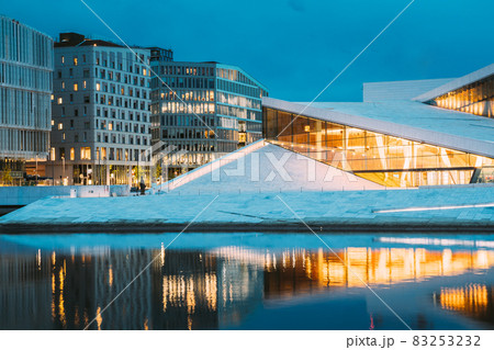 Oslo Norway. Evening View Of Illuminated Opera Ballet House Among High-Rise Buildings Under Blue Sky