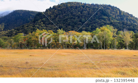 秋の尾瀬、草モミジの紅葉に包まれた尾瀬ヶ原と尾瀬沼トレッキング、群馬県,日本