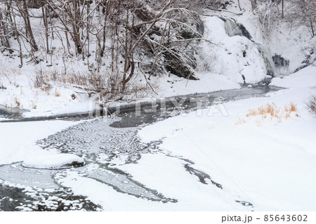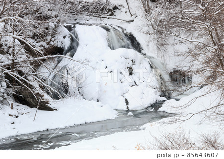 北海道由仁町、雪に覆われた於兎牛沢川の滝(オソウシの滝)【12月】
