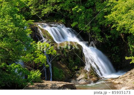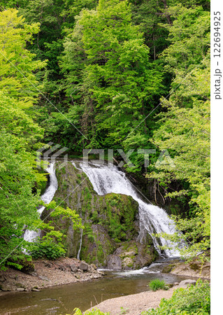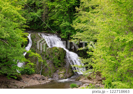 北海道由仁町、新緑に覆われた於兎牛沢川の滝(オソウシの滝)【5月】