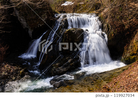 北海道由仁町、雪解け水が流れ落ちる於兎牛沢川の滝(オソウシの滝)【4月】