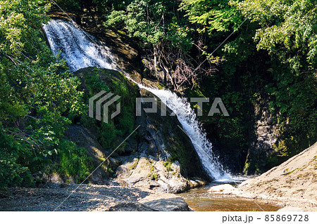 北海道由仁町、緑に覆われた初夏の於兎牛沢川の滝(オソウシの滝)【6月】