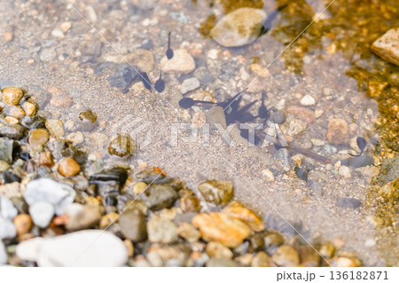 澄んだ川の浅瀬を泳ぐオタマジャクシの群れ