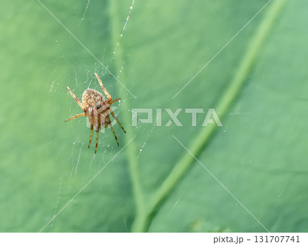 葉の上で静止するコガネグモ科コゲチャオニグモ♀