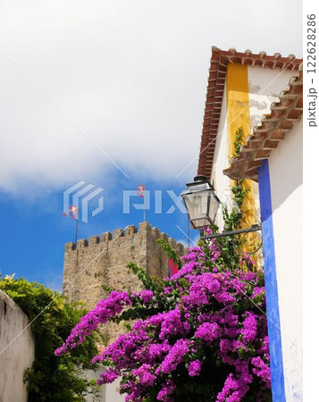 ポルトガル、オビドス オビドス城の塔と美しいブーゲンビリア