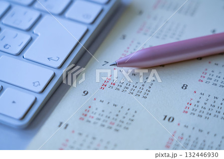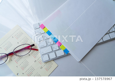 テーブルに置かれたカレンダーとキーボードとメガネ