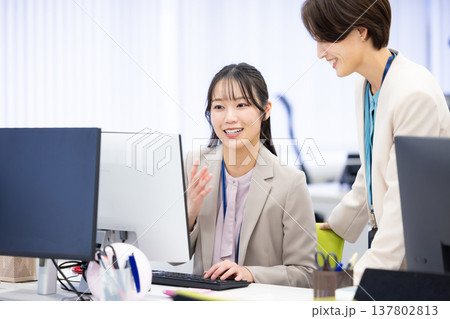打ち合わせをする先輩と新人女性会社員のイメージ
