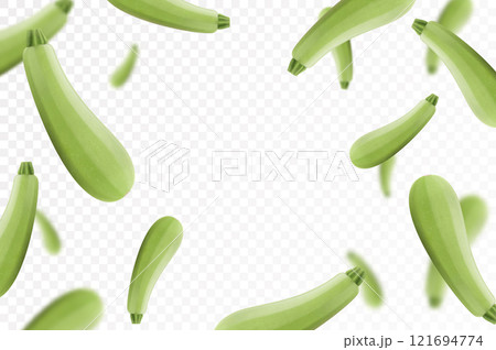 Falling zucchini isolated on transparent background. Flying whole and sliced zucchini vegetable with blurry effect. Can be used for advertising, packaging, banner, poster, print. Realistic 3d vector