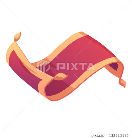 A rectangular red flying carpet with gold stripes along the edges and tassels on the corners.