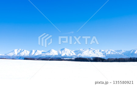 冬の北海道美瑛町の丘から見た冠雪した十勝岳連峰の風景