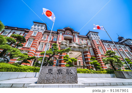 日本の東京都市景観 歴史的猛暑日…6月だがまるで真夏…東京駅赤レンガ駅舎などを望む