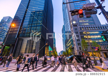 日本の東京都市景観 コロナ禍の大手町駅前交差点からオフィスビル群などを望む・奥は神田方向=4月12日