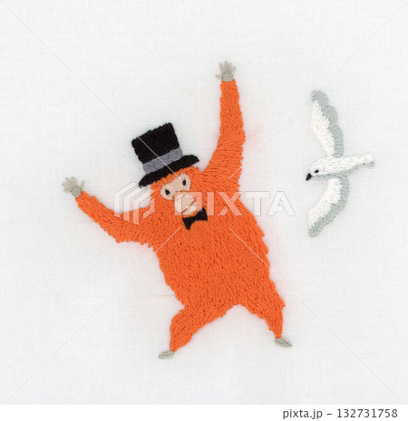 シルクハットを被ったオレンジのオランウータンと白い鳥の刺繍