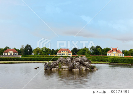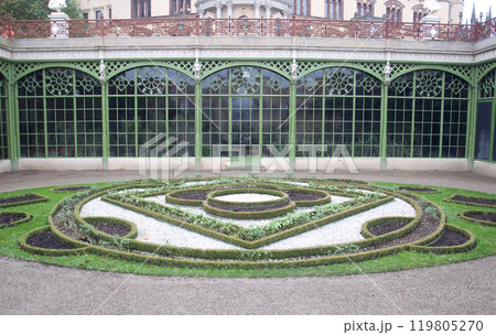 ドイツ、シュヴェリーンにあるシュヴェリーン城の庭園の湖畔施設中心にあるオランジェリー(温室)の風景