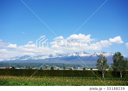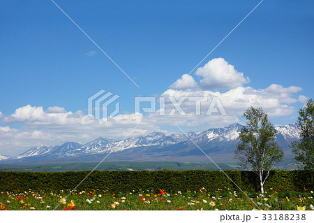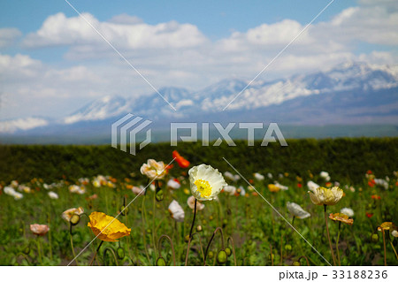 初夏の北海道富良野の大地に咲いたオリエンタルポピーの花畑