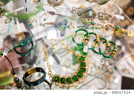 Handmade bracelets with precious stones on showcase of a jewelry store