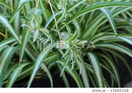 Closeup spider plant or Chlorophytum comosum in pot with water drop