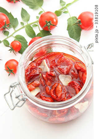 ドライトマト 瓶詰め 木製テーブル 沢山 上から 縦