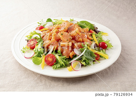 サーモンオリーブオイル漬けを使ったサラダ