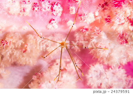ピンクのサンゴの中に隠れるオルトマンワラエビ