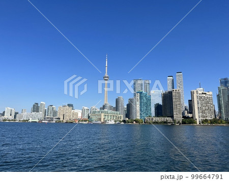 カナダ・トロントアイランドに向かうフェリーからの景色(オンタリオ湖・CNタワー・ダウンタウン)